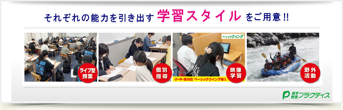 プラクティスの映像学習は「思考する」「入力する」「確認する」「出力する」にこだわっています。 昨年より、映像授業がリニューアル。 中学生は、国語の学校準拠の映像授業が実現。 学校の定期テストの対策・演習も行えるようになります。 さらに高校生には高1から大学受験に必要な全ての科目の映像授業がご提供できるようになりました。 高校1年生から大学受験に特化した学習ができるので最短での学習が実現。